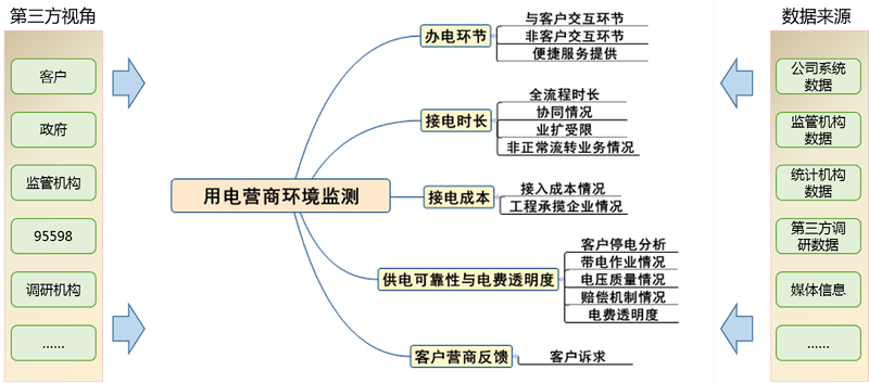 对标世界银行营商环境标准体系,综合世界银行获得电力指标计算标准(获得电力手续、时间、成本,供电可靠性及电费透明度)、电力企业本地非电力指标计算标准(用户用电反馈、业扩受限、负载程度)构建电力营商环境评价体系,对电力营商环境完成总体评价。全方位对比世界先进经济体,发现当前薄弱环节,进行针对性整改,提升电力营商环境指数。